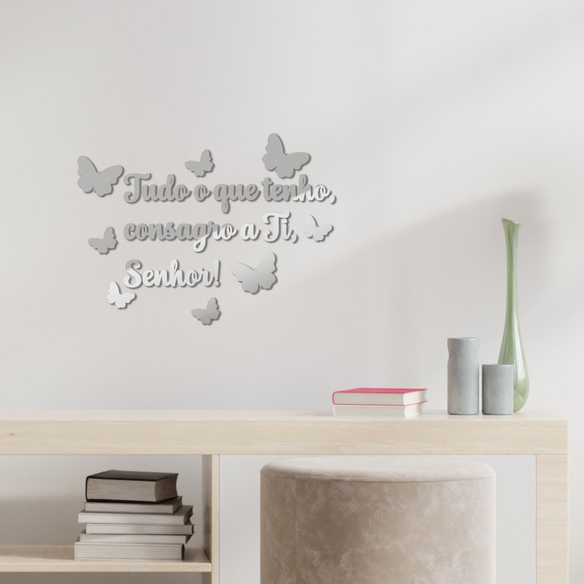 Espelho "Tudo o que tenho, consagro a Ti, Senhor!" com Borboletas - Acrílico Espelhado Prata