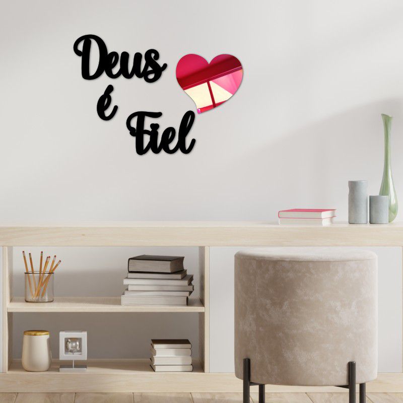 Quadro com Escrita Deus é Fiel com Coração Vermelho Espelhado